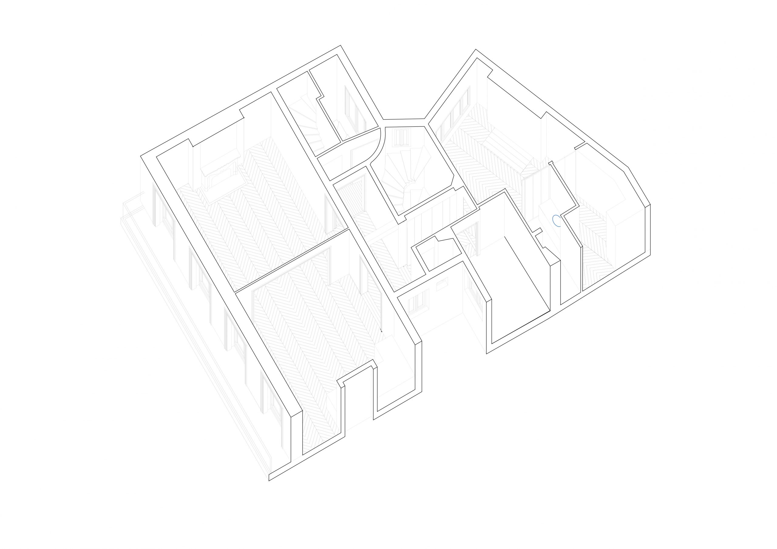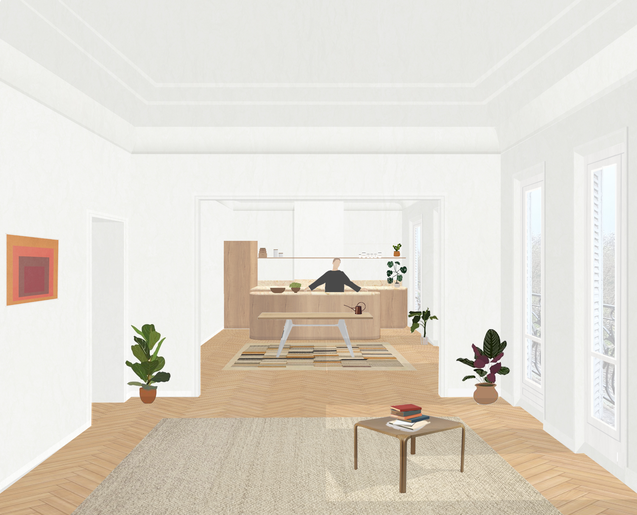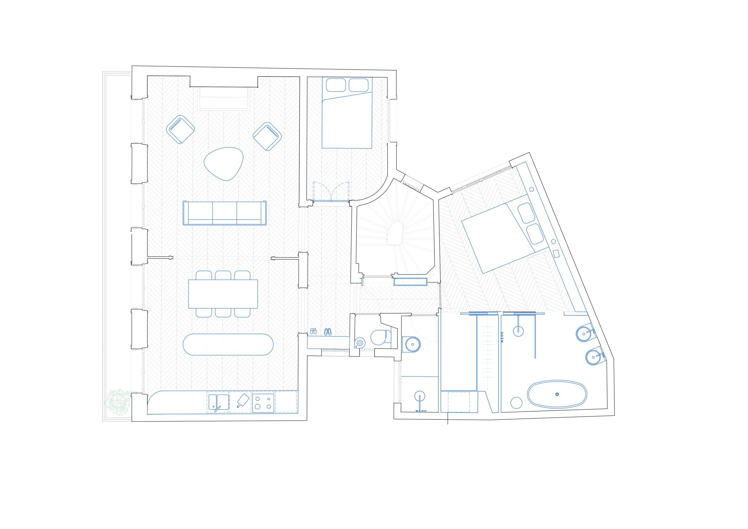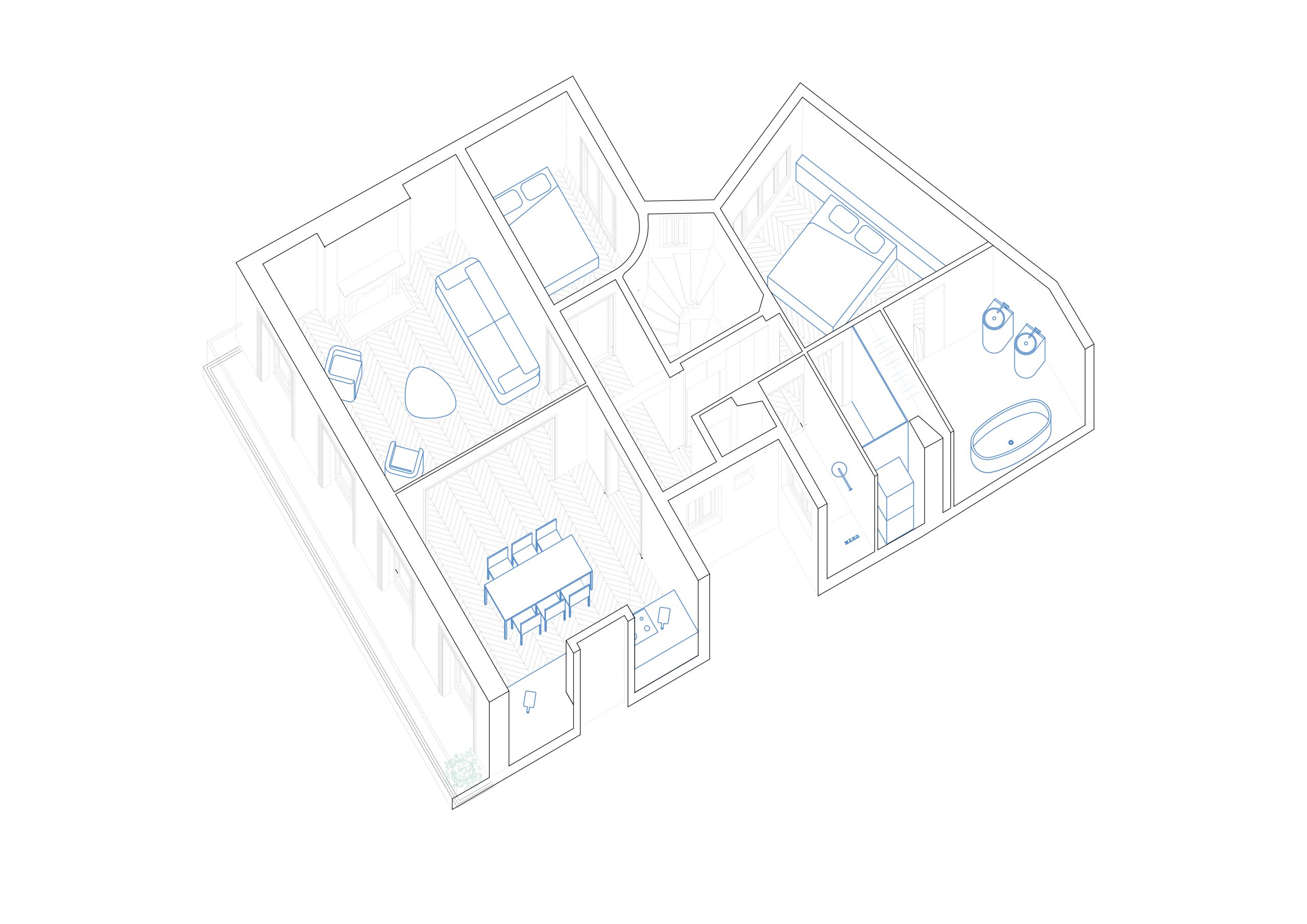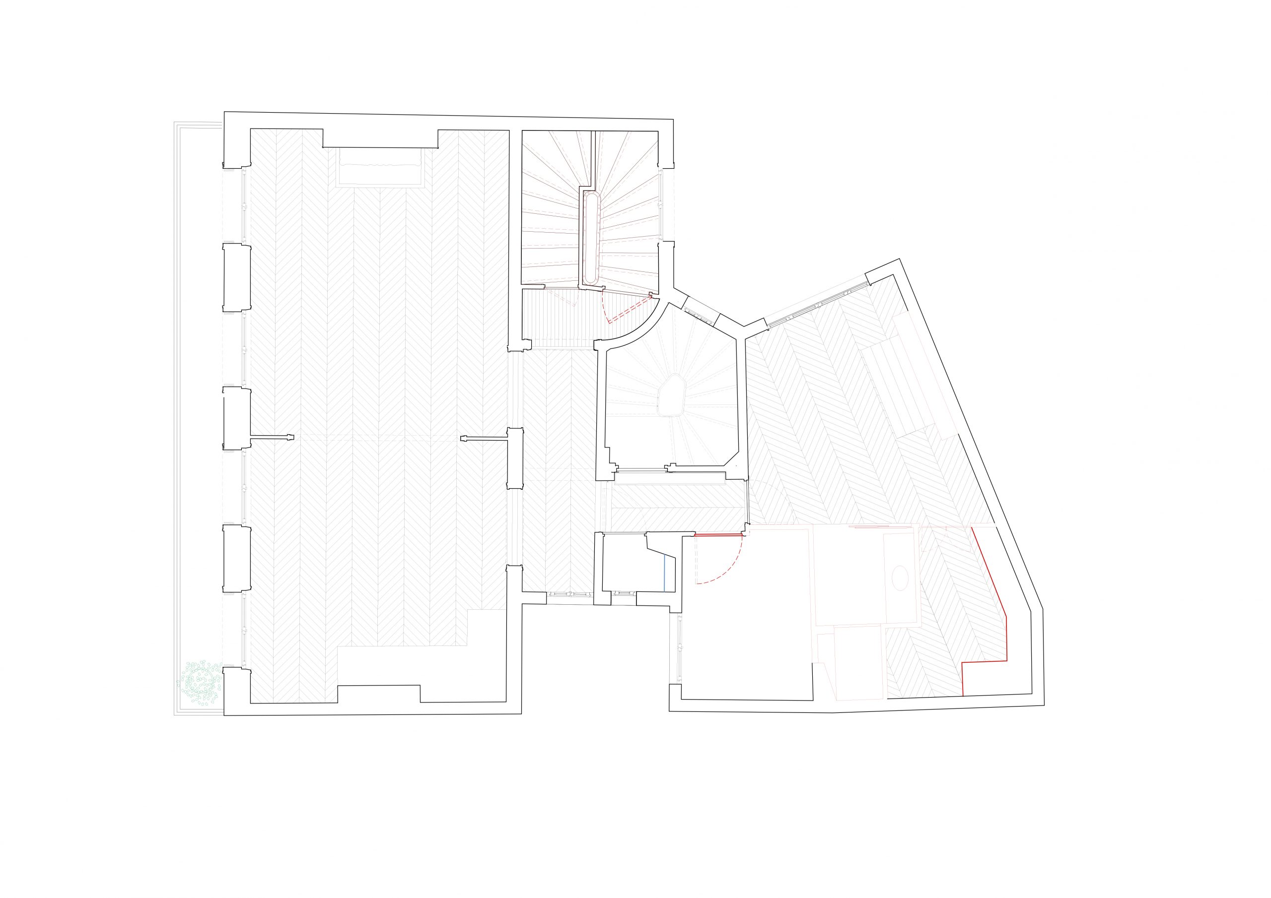 Initialement desservi par deux cages d’escalier, l’appartement est réorganisé pour clarifier sa distribution. L’entrée est désormais recentrée au cœur du logement, l’escalier auparavant secondaire devenant l’accès principal. L’entrée initiale est condamnée et l’escalier démoli, permettant ainsi l’extension de l’appartement et la création d’une chambre d’amis.