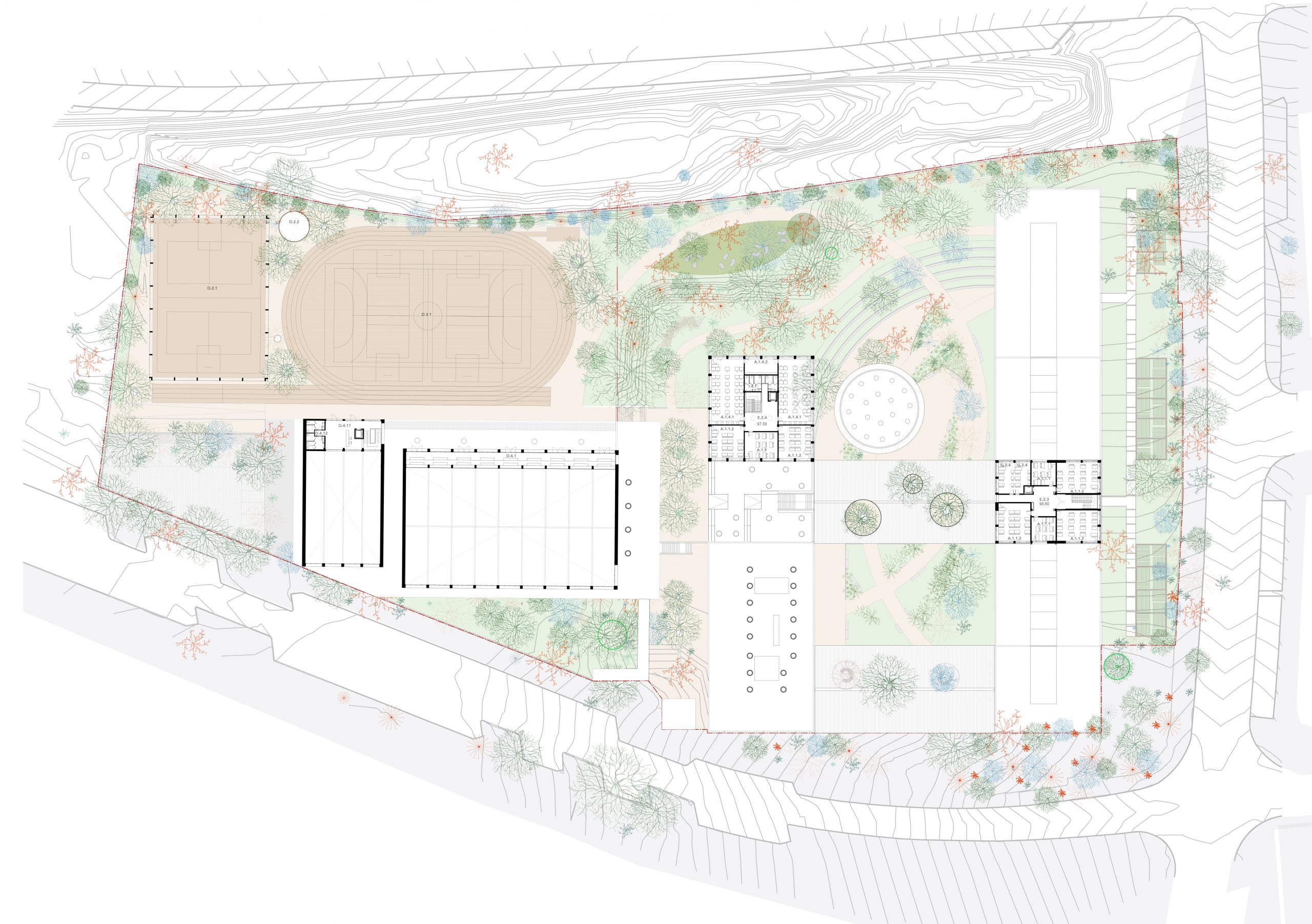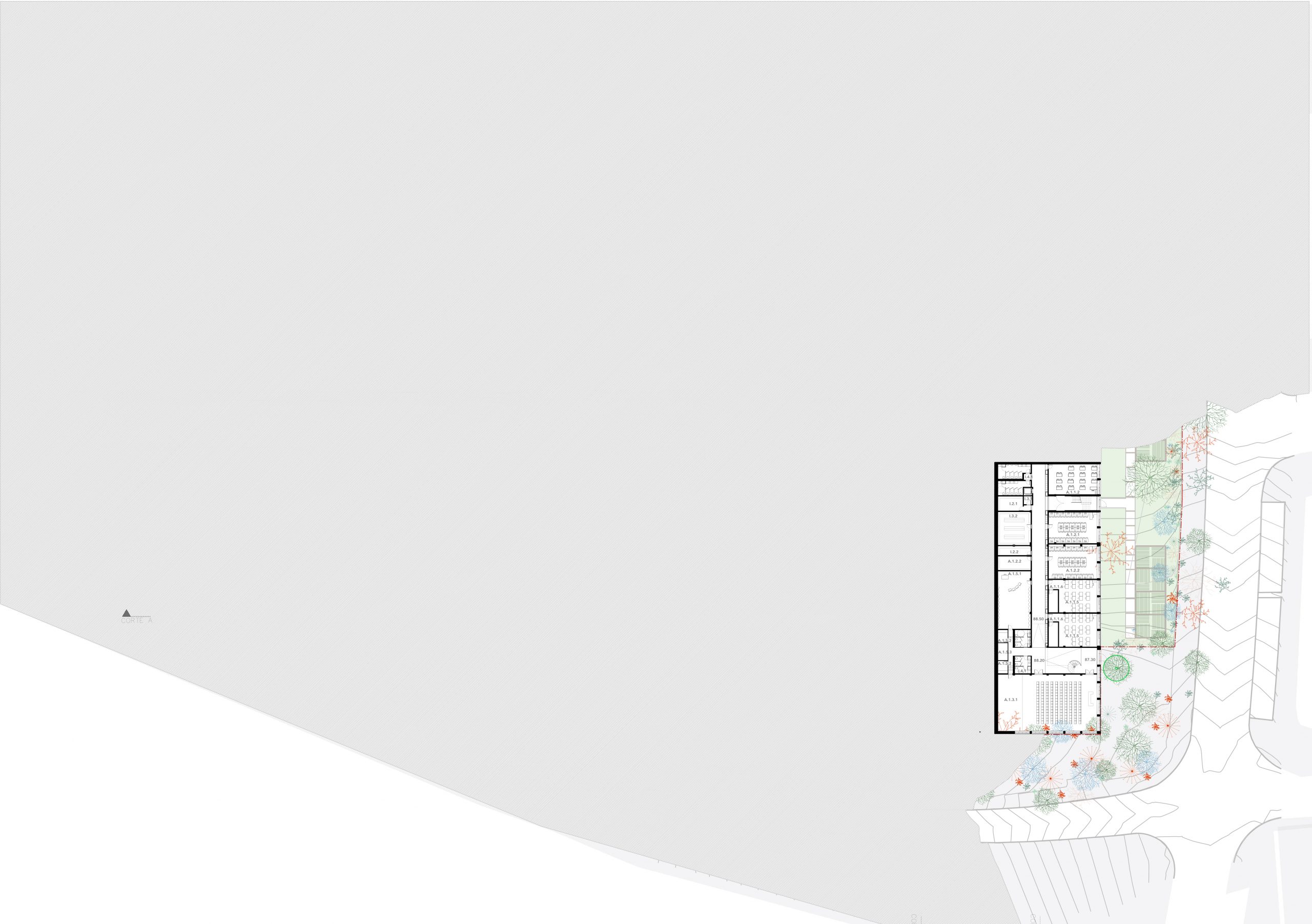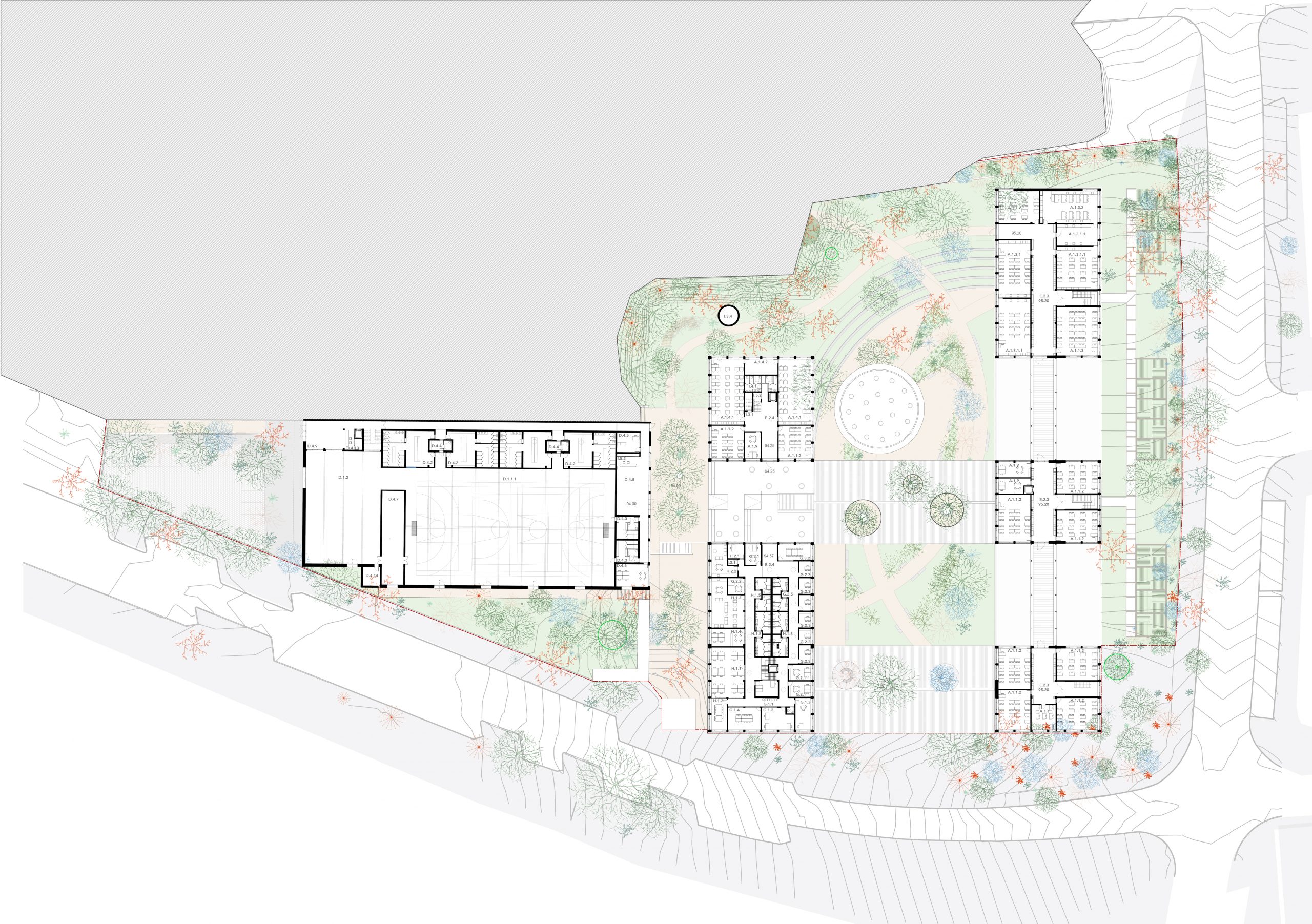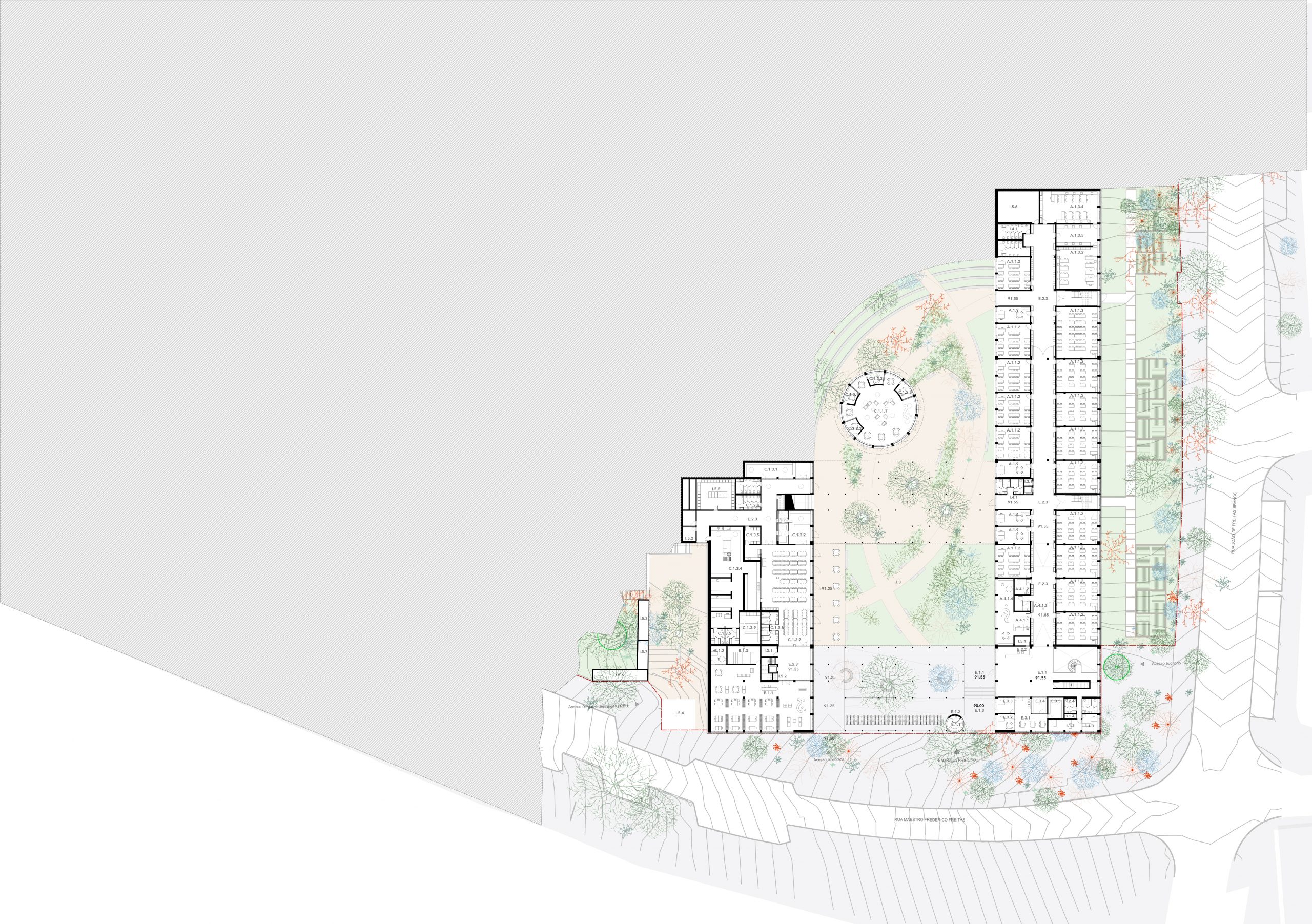L’organisation repose sur deux corps bâtis principaux, reliés et complétés par de nouveaux volumes, assurant une distribution fonctionnelle claire et des parcours continus et inclusifs. Les espaces extérieurs, conçus comme un grand jardin structurant, jouent un rôle central : ils articulent les bâtiments, accompagnent les dénivelés du terrain et constituent le cœur vivant de l’établissement.